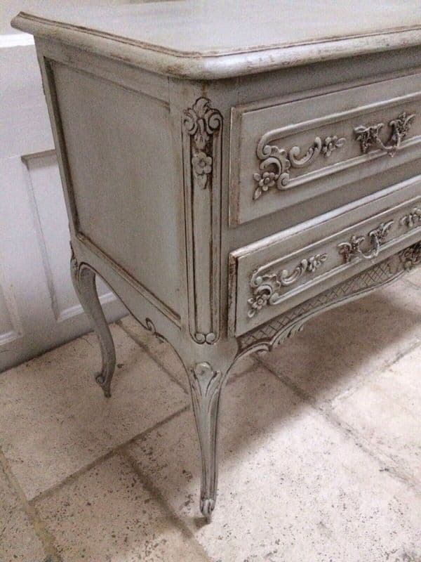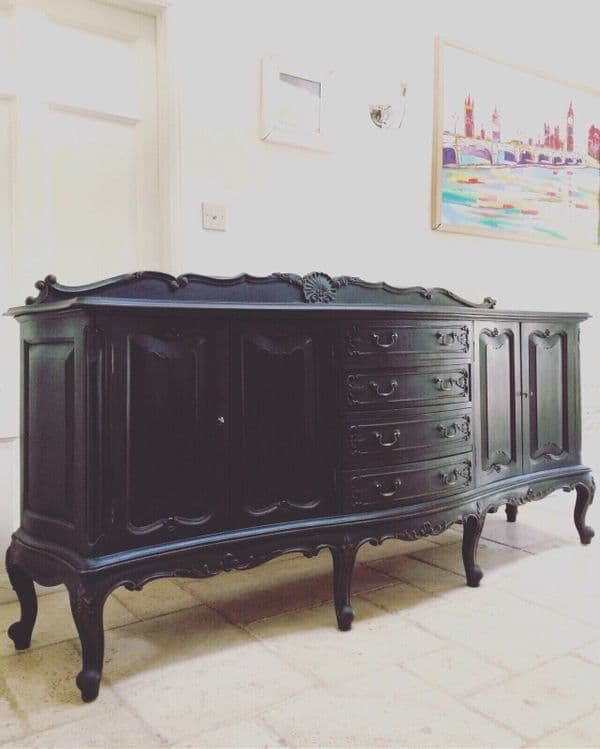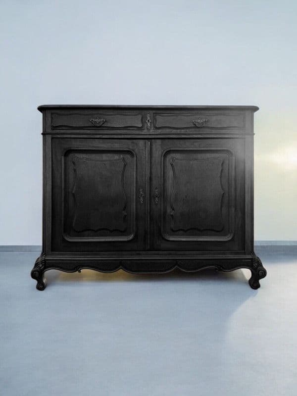 Impressive C19th French Antique Oak Cupboard with two drawers in good Antique Condition. Lot's of wear and tear commensurate with age, but the price includes painting in the colour of your choice so finish will look much cleaner when painted. Photos are a good representation of condition. Top is quite rough, clearly it originally had a piece on top, but holes with be filled before painting. Lovely carving to legs and around the base. We have included a digital edit in the photos to give an impression of the sideboard in black and also the last photos show some similar style French sideboards painted. Interior is in good condition.