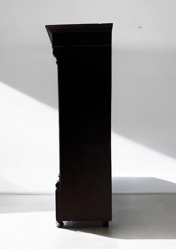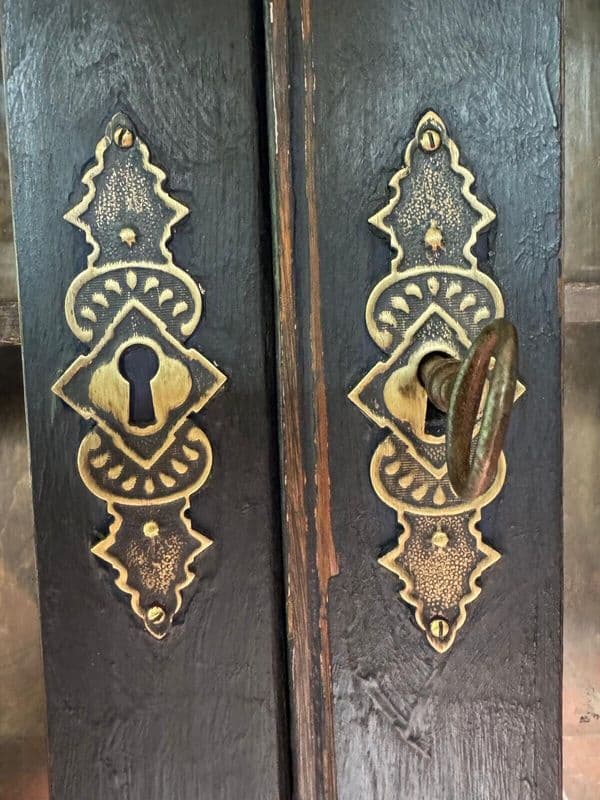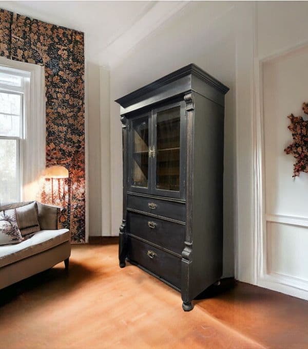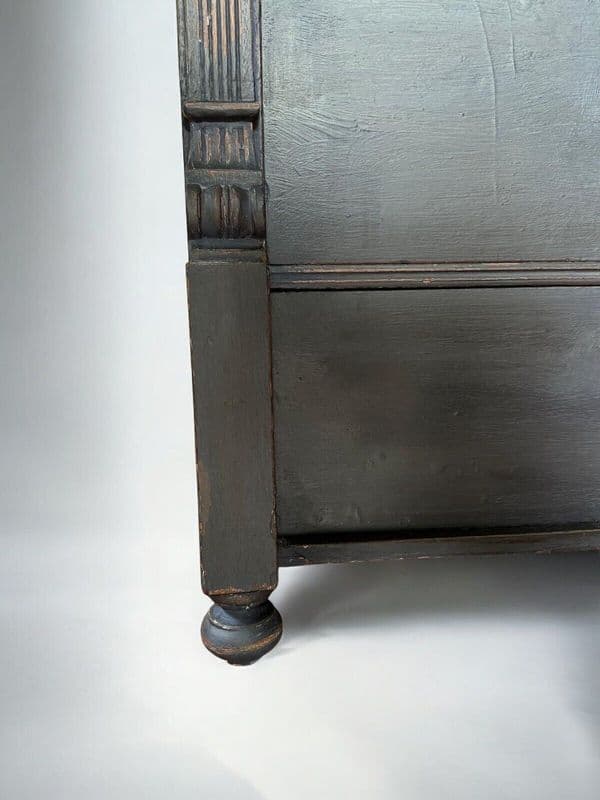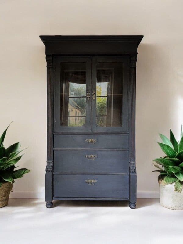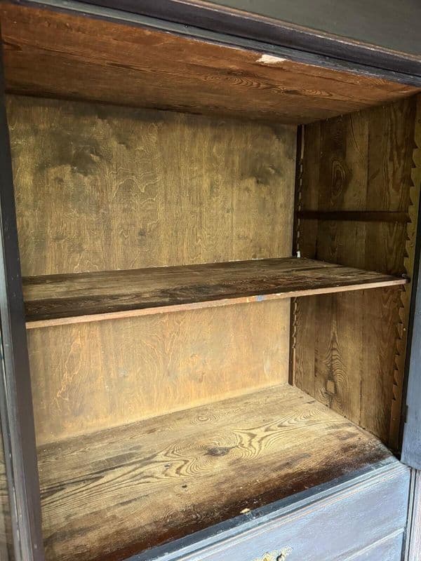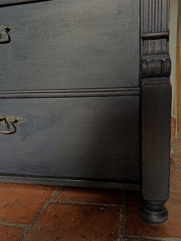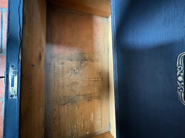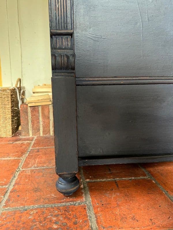 Hand painted in Annie Sloan Oxford Navy, painted over previously painted surface, also in Navy. Distressed edges to enhance the aged look. In good overall Antique condition. Plenty of character. Structurally sound, wear and tear, commensurate with age. Drawers open and close ok, and are in good functional and useable condition. There is a lock to the cabinet but only a dummy key.
