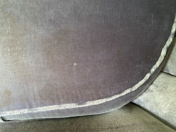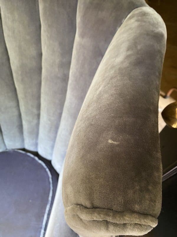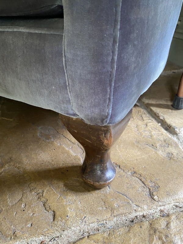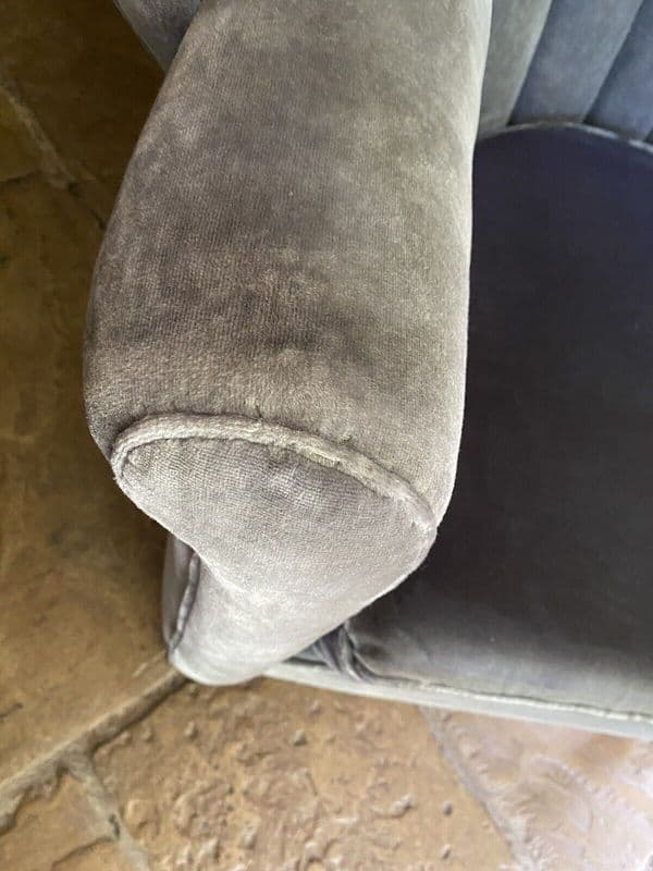 Upholstery is in fair condition but is quite worn on one of the arms - see photo. Few marks here and there but still very useable. Would benefit from reupholstery. The seat sinks a bit at the back when you sit in it, so webbing may need strengthening. Feels like a cocoon when sitting in it.