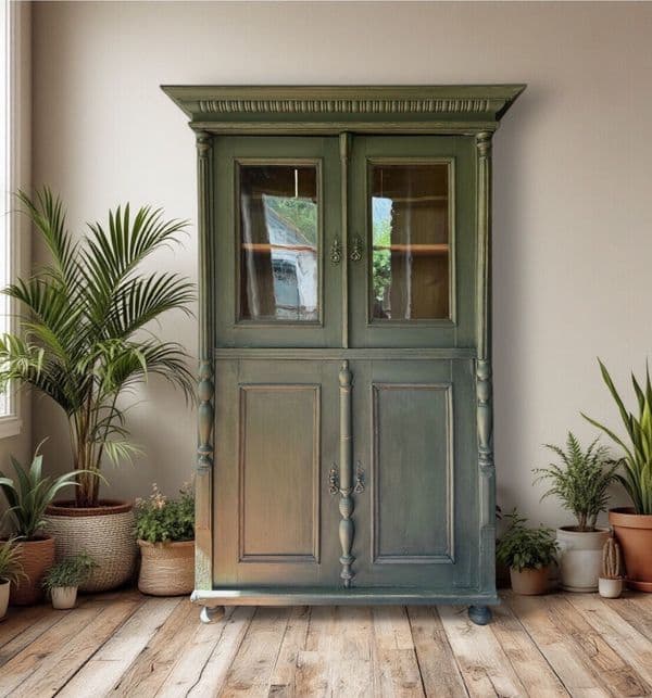 Antique Vintage Olive Painted Solid Pine Armoire Glazed Dresser Display Cabinet Cupboard
